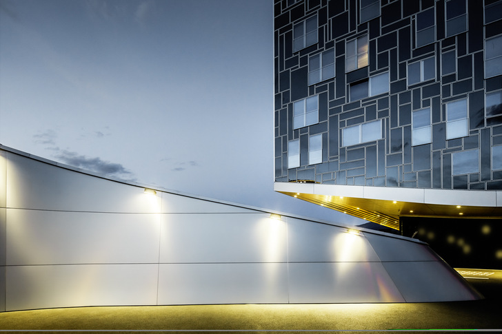 Besonders beim Plateau, das wie eine Zäsur das Gebäude gliedert, wurden vorwiegend Aluminiumprodukte der Marke Prefa eingesetzt. Die Architekten suchten dafür ein flexibles Material, das die technischen Einrichtungen des Gebäudes perfekt integriert. Die Prefa-Verbundplatte mit einer Oberfläche aus gebürstetem Aluminium wurde an der geschwungenen Fassade verarbeitet. Auffällig sind die exakt verlaufenden Plattenstöße, die um den geschwungenen Baukörper verlaufen. Für die gebogene bzw. geschwungene und in verschiedenen Neigungswinkeln verlaufende Attikaabdeckung des Dachaufbaus kamen kleinteilige Profile aus bandbeschichtetem Aluminium zum Einsatz.