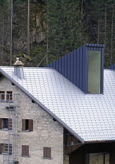 Im Herbst 2012 erhielt das über 1000 m 2 große Dach des Zeughauses Stücki im urnerischen Göschenen eine neue Dacheindeckung. Die Fachleute der Bless AG aus Erstfeld im Schweizer Kanton Uri verarbeiteten dazu Aluminium-Dachplatten der Marke Prefa. Außerdem bekleideten sie auf über 300 m 2 Dach- und Fassadenfläche futuristisch anmutende Lichtschachteln (Lukarnen) mit farbbeschichtetem Aluminium. Bereits in der Planungsphase war die Bless AG mit den renommierten Zürcher Architekten M. Burkhalter und C. Sumi von Burkhaltersumiarchitekten involviert und konnte so den Entstehungsprozess der baulichen Verbesserung und Veränderung des Daches mitgestalten und enorme Erfahrung im Metalleindeckungsbereich einbringen. Um der geänderten Nutzung gerecht zu werden, musste die gesamte Dachfläche gedämmt und neu eingedeckt werden. Zuerst wurden über 1000 m 2 Ziegeleindeckung einschließlich entsprechender Lattung entfernt und entsorgt. Durch den beauftragten Zimmerer wurde das restliche Holz entfernt und der neue Dachaufbau bis zur Konterlattung realisiert. Anschließend kam wieder die Bless AG zum Einsatz. Zur Dachentwässerung setzten sie die alten und zuvor vorsichtig demontierten Kupferrinnen ein. Montiert wurden sie mit sogenannten Hochgebirgshaken. Anschließend bekleideten sie die Stirn- und Ortgangbretter mit hellgrau beschichtetem Farbaluminium der Marke Prefa und zwar so, dass diese den extremen winterlichen Belastungen standhalten können. Die Hauptdachfläche deckten sie ebenfalls mit hellgrau beschichteten Prefa-Aluminium-Dachplatten ein. Als Unterkonstruktion dient eine 30/50-Dachlattung. Zur Verbesserung der Auflagestabilität wurden entsprechende Zwischenlatten angebracht. Die erforderlichen Anschlussprofile statteten die Spengler der Bless AG mit vertieften Rinnen aus und zur Verbindung der Profile setzten sie ausschließlich Falztechnik ein.