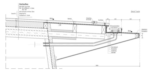 Die Realisierung der Traufe hatte es ebenfalls in sich. Breite Kantteile wurden eingesetzt. Die Auskragung betrug am höchsten Punkt des Gebäudes 15m. Trotzdem konnte letztendlich, durch die Erfahrung der Beteiligten, die gewünschte schlanke Form umgesetzt werden. Die Zambelli Rib-Roof GmbH & Co. KG erstellte außerdem den Schneefang als Sonderanfertigung, um diesen dezent zu platzieren, ohne die Funktion zu beeinträchtigen.
