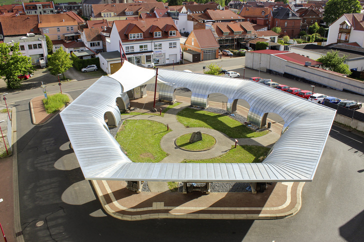 Nicht nur Projekte auf Bundesebene profitieren von den Fördermaßnahmen, sondern auch Knotenpunkte in ländlichen Regionen. Die Thüringer Gemeinde Dingelstädt ließ ihren Busbahnhof instand setzen und das Dach in Stehfalztechnik mit Rheinzink Titanzink in der Oberflächenqualität Classic walzblank eindecken. Der Fachbetrieb Holzapfel Bedachungen von Dachdeckermeister Marco Holzapfel montierte die Bekleidung am ZOB. Die Sanierung sorgt aufgrund der frei gerundeten Linienführung für Aufsehen. Der neue Dingelstädter ZOB wurde im Vorfeld mittels CAD und SEMA bis ins Detail geplant, von der Baubreite der Scharen bis hin zur Position auf dem Dach.