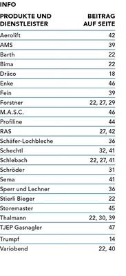 Die umfangreiche BAUMETALL-Produktschau berichtet nicht nur von der Euroblech, sondern beinhaltet auch Reportagen und ergänzende Produktvorstellungen. Nebenstehende Tabelle erleichtert die Übersicht, ein begleitendes Online-Extra rundet das Informationsangebot mit weiteren Fotos ab. Übrigens: Auf http://www.facebook.com/Baumetall sind nach wie vor die Live-Fotos des BAUMETALL-Messebesuches sowie entsprechende Kommentare zu sehen.