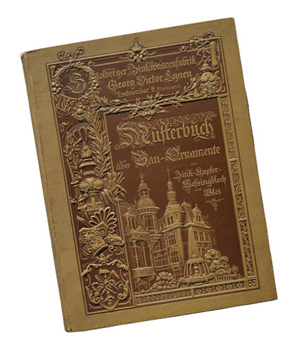 Heute stelle ich ein absolutes Highlight vor: das Musterbuch der „Stolberger Zinkwaarenfabrik Georg Victor Lynen, aus Eschweiler 2“. Die damals weitbekannte Firma aus dem Rheinland war spezialisiert auf die Herstellung von architektonischen und dekorativen Bauornamenten aus Zink, Kupfer, Messingblech und Blei. Zu ihrem Portfolio gehörte auch die Ausführung von detailgetreuen Skulpturen, großvolumigen Statuen und Monumenten aus Zinkguss (gegossenes Zink in verschiedenen Legierungen). Dieses aufwendig gestaltete Musterbuch wurde als 9. Auflage 1899 von der Lithographischen Anstalt, Buch & Steindruckerei von Th. Fuhrmann in Köln gedruckt.