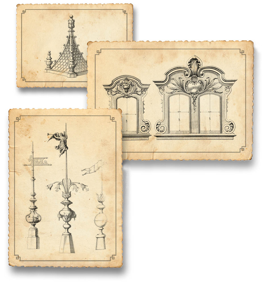 Als kleine Besonderheit fallen die anschaulichen Detailzeichnungen ins Auge, auf welchen historische Gebäude dargestellt sind, bei denen das jeweilige Bauteil (z. B. „Thurm“) zum Einsatz gekommen ist. Für den Bauklempner und seinen Kunden stehen in diesem Musterbuch u. a. zur Auswahl: 226 Mansarden-Dachfenster (Attic-Windows); 278 Dachspitzen (Terminals); 72 Wetterfahnen (Weather flags); 28 Mansardendach-Ecken (Roof-Corner); 28 Thürme/Türme (Tower); 19 Giebelbekrönungen (Pedimends); 9 Wasserabflussleitungen/Ornament-Ablaufrohre (Ornamental rain water pipes); 61 Wasserspeier (Gargoils); 9 Schuppenbleche/gestanzte Lochblechtafeln (Plete-scolloped). Ergänzend kommen hinzu: