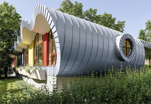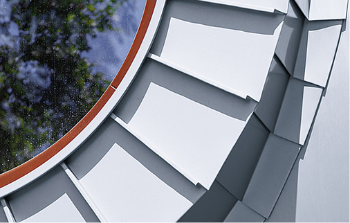 Die Profile in der Qualität Rheinzink-prePatina blaugrau wurden in zwei unterschiedlichen Techniken verlegt – auf dem Dach in Doppelstehfalz- und bei der Attika sowie den Fenstereinrahmungen in Winkelstehfalztechnik. Dafür sprachen in erster Linie technische Gründe. Der Doppelstehfalz wird üblicherweise bei Dachneigungen ab 3° eingesetzt. Er eignet sich aber ebenso für konkave und konvexe Formen und ist ohne zusätzliche Maßnahmen regensicher. Diese Eigenschaft ist beim Kindergartenanbau in Prag insbesondere im unteren Bereich der beiden Zylinder von Vorteil. Aus gestalterischer Sicht unterstreicht der Doppelstehfalz mit seinen feinen Linien die Wellen des Daches und ihre zylindrischen Rundungen.
