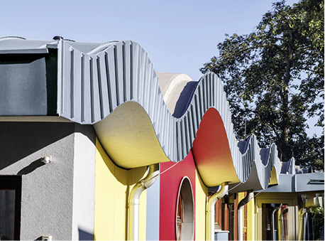 Bilbo Beutlin aus dem Auenland hätte bestimmt seine helle Freude gehabt an dem bunten Haus mit dem wellenförmigen Dach, den runden Außenwänden und den hervorstehenden Bullaugenfenstern. Doch der Neubau wurde nicht für Hobbits gebaut – vielmehr erweitert er einen bestehenden kirchlichen Kindergarten im Zentrum von Prag. Im Süden grenzt das Grundstück an den Letna-Park, eine weitläufige Parkanlage. Die Wohnbebauung im Norden und Osten stammt überwiegend aus den Anfängen des 20. Jahrhunderts und weist die für die Gründerzeit typische Fassadengestaltung auf. Im Westen befindet sich der bestehende Kindergartentrakt, der als schmuckloser Stahlbetonskelettbau in den 1970er-Jahren errichtet wurde. In dieser heterogenen städtebaulichen Umgebung wollten die Architekten František Prajer und Ji