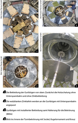 Um das Gewölbe zu bekleiden, war der Münsteraner Traditionsbetrieb mit drei Klempnern vor Ort. Die Handwerker verlegten die 0,7 mm starken Titanzinktafeln per Flachfalztechnik auf der gewölbten Holzschalung und befestigten sie mit Edelstahlhaften. „Die Flachfalze wurden bei den einzelnen Flächen immer zur wetterabgewandten Seite angeordnet. Die einzelnen Teilstücke für die Kuppel sowie die Gurtbögen haben wir auf Maß in der Werkstatt von Plenter gefertigt“, erklärt der Geschäftsführer. Die Größe der Profile nimmt vom Fuß bis zur Spitze der Kuppel ab, während ihr Format vom Rechteck ins Trapez übergeht. Eine Unterspannbahn trennt die Metalleindeckung von der Schalung. Beim Verlegen passten die Handwerker die ursprünglich planen Tafeln zudem an die gewölbte Oberfläche der Kuppel an.