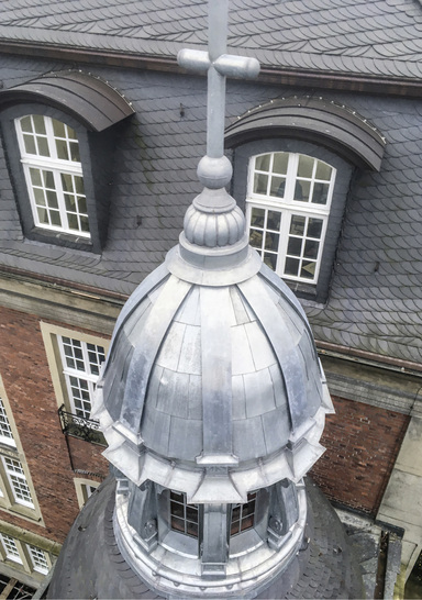Das Original so genau wie möglich wiederherzustellen bildete zu jedem Zeitpunkt den Maßstab der Arbeiten. Eine denkmalgerechte Sanierung wie diese wäre ohne das Klempnerhandwerk undenkbar gewesen. Das Bauwerk mit seiner wechselvollen Geschichte steht einige Kilometer nordöstlich von Münster und zählt zu den Sehenswürdigkeiten des Ortes Ostbevern. Seine heutige Gestalt erhielt das Gebäude erst durch einen Wiederaufbau in den Jahren 1900 bis 1901. Zuvor, 1899, hatte ein Brand das frühere Barockschloss von 1760 fast völlig zerstört. Das wieder errichtete Schloss ähnelt zwar dem früheren Bau, ist jedoch fast doppelt so groß wie der vorherige. Weil es von künstlich angelegten Gräben umgeben ist, trägt es die Bezeichnung Wasserschloss. Genutzt wird das Bauwerk, das sich in Privatbesitz befindet, seit 1951 als Gymnasium mit Internat in kirchlicher Trägerschaft. Die Arbeiten erweisen sich als Aushängeschild für die ausführenden Fachbetriebe und die Branche insgesamt. Ein Gebäudeflügel über einem Wassergraben schmückt sich mit der restaurierten Laterne.