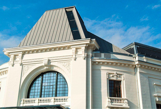 Dach: Doppelfalzdach und klassische Ornament-Spenglerarbeit in vorbewittertem Titanzink der Marke VM-Zinc