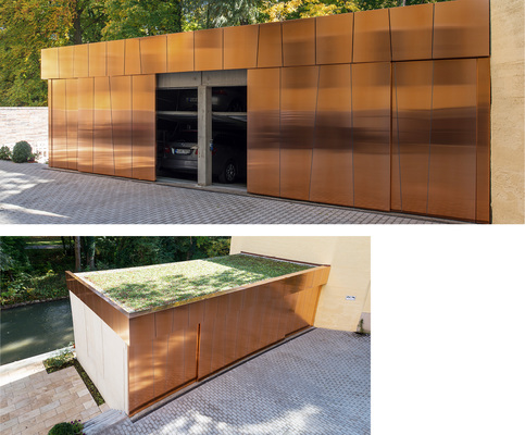 Am Beispiel der Kupfer-Garagentore wird deutlich, wie vielseitig Verbundtafeln eingesetzt werden können. Spenglermeister Andreas Fella verklebte die 4 mm dicken Tecu-Bond-Platten direkt auf der Unterkonstruktion. Diese besteht aus Aluminiumkonsolen und entsprechenden L-Winkeln. Das Besondere: Die verschiebbaren Garagentore wurden ebenfalls mit Tecu-Bond-Classic bekleidet. In geschlossenem Zustand ist die Garage nicht als solche zu erkennen, sondern erinnert an einen kupfernen Kubus. Durch die unterschiedlichen und trapezförmigen Zuschnitte der einzelnen Verbundplatten wirkt die Torbekleidung trotz ihrer Fläche von etwa 50 m² filigran. Die sich anschließende Flachdach-Randbekleidung nimmt das Raster der Torbekleidung auf, wodurch der ursprünglich schmucklose Baukörper zum architektonischen Highlight des sich angrenzenden Gebäudeensembles wird.