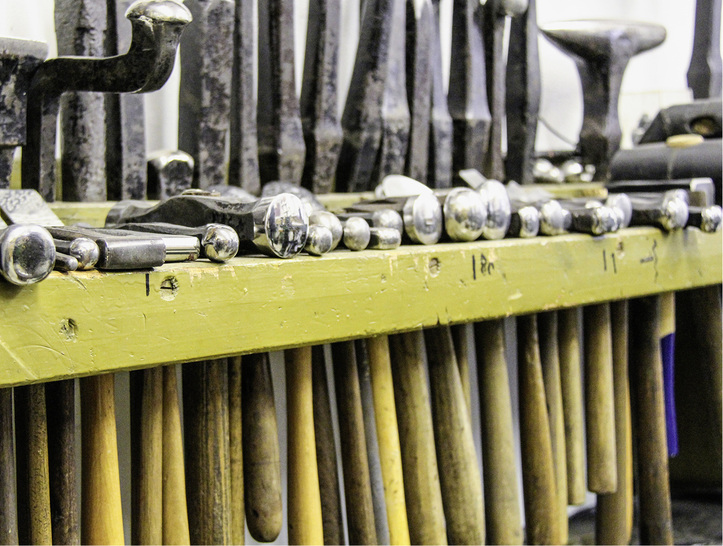 Als ich Schulzes Refugium betrete, fällt mir vor allem eines auf: Jedes Werkzeug befindet sich an seinem Platz und jede Maschine ist in einem tadellosen Zustand. Vermutlich über 100 Jahre alte Dreh- und Drückbänke glänzen wie neu. Die daneben stehende Schlagschere ebenso. Und nur weil die blaue Lackierung der nagelneuen segmentierten Schwenkbiegemaschine von Schechtl nicht so recht ins hammerschlaggrüne Umfeld passt, sticht sie besonders hervor. Eine Augenweide der besonderen Art sind die in Reih und Glied aufgehängten Blechscheren, Zangen und Hämmer. In polierten Hammerfinnen, Bahnen und Kugelköpfen reflektiert sich das Neonlicht. An den teilweise extrem abgegriffenen Stielen erkenne ich, dass vermutlich jeder zweite Hammer manche Geschichte erzählen könnte, wenn er könnte. Muss er aber nicht, denn zum Glück ist Manfred Schulze da: „Einige dieser Schlagwerkzeuge hatten Gesellen in der Hand, die ich nicht mehr kennenlernen durfte. Lange vor meiner Zeit arbeiteten sie bei meinem Vater und davor bei meinem Großvater.“ Insgesamt 16 Gesellen hat er ausgebildet, sagt Schulze. Keiner von ihnen wollte bleiben. Wachdienstmitarbeiter, Fabrikangestellte oder Taxifahrer werden eben auch gebraucht. Vielleicht sogar öfter als Ziseleure. Dann nimmt Schulze einen besonders charismatischen Hammer in die Hand und erklärt, warum nur Ziselierhämmer diesen typischen, markanten Griff haben: „Jeder einzelne Hammerschlag muss punktgenau und mit exakter Schlagkraft platziert werden.“ Offensichtlich bedarf es dazu jahrelanger Erfahrung.