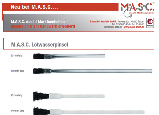 Lötwasserpinsel mit Rosshaaren oder Schweineborsten haben Klempnermeister früher selbst gemacht. Heute ist Zeit bares Geld und entsprechend kostbar. Daher ist es gut zu wissen, wo es sie noch gibt – die guten alten Dinge. Die Fachbetriebsausstatter von M.A.S.C. kümmern sich mit viel Sachverstand um ganz große sowie klitzekleine Hilfsmittel. Aus diesem Grund gibt es die M.A.S.C.-Lötwasserpinsel als extra schmale Version für Lötwasserflaschen mit Auslaufstopp. Noch besser ist, dass die mit echten Schweineborsten versehenen Metalllötwasserpinsel mit 150 mm langem Stiel (140 mm bei Kunststoff) erhältlich sind.