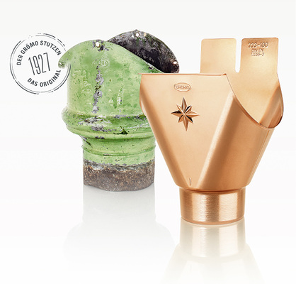 Erstmals taucht der Grömo-Einhangstutzen unter der Bezeichnung Rinnenstutzen bzw. Dachrinnenkessel auf: Für das Produkt liegt ein Schweizer Patent aus dem Jahr 1927 vor. Somit sollte klar sein: Der Stutzen hat eine lange Tradition und wurde mit den Jahren und den steigenden Anforderungen kontinuierlich bei Grömo verbessert und angepasst. Die beiden Spenglermeister Karl und Georg Rösle erfanden den Rinnenstutzen und meldeten das Patent an. Ihr Vater Karl Theodor Rösle hatte bereits 1888 den Grundstein für die beiden Unternehmen Rösle und Grömo gelegt. Zu Beginn wurden die Stutzen noch gefalzt und gelötet, heute werden sie stumpf geschweißt. Dadurch sind die Verbindungen zwischen den beiden Halbschalen kaum mehr erkennbar. Der achtstrahlige Stern schmückt alle Grömo-Produkte, viele Kunden fragen heute nur noch nach dem „Stutzen mit dem Stern“.