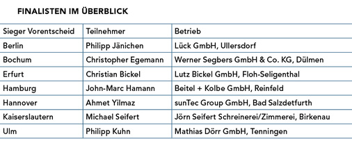 Der Fachkräftemangel ist längst im Handwerk angekommen. Um auf das Potenzial, die Qualität und Fertigkeit von jungen Handwerkern aufmerksam zu machen, startete Rheinzink, Hersteller von Titanzink für Dachrinnen, Fallrohre, Dachdeckungen und Fassadensysteme, in diesem Jahr einen Wettbewerb für junge Gesellen im Dachdecker- und Klempnerhandwerk. Je Rheinzink-Vertriebsniederlassung (7 Stück) gab es einen Vorentscheid. Hier mussten die Teilnehmer (Dachdecker-/Klempnergesellen im ersten oder zweiten Jahr) an einem typischen Dachmodell folgende Aufgabenstellung lösen: Montage der Dachentwässerung, Ortgangbekleidung, Anschlüsse / Abdeckungen und Kamineinfassung. Die sieben Sieger der Vorentscheide haben sich Mitte April 2015 zum großen Finale am Rheinzink-Hauptstandort in Datteln getroffen. Diesmal ging es in der Aufgabenstellung um die Dachdeckung mit Stehfalzscharen, der fachgerechten Einbindung eines Sanitärentlüfters sowie die Montage der Dachrinne. In sieben Stunden galt es die Herausforderung zu meistern.