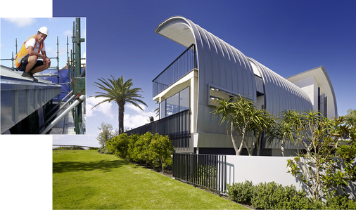 Ich bin wieder in Sydney bei ARC-Roofing. Der australische Sommer beginnt und es wird täglich wärmer. Optimales Klempnerwetter. Gemeinsam mit Bodo Hinz mache ich zahlreiche Baustellen unsicher. Mal werten wir ein altes Brauereigebäude durch den Einsatz perforierter Rheinzink-Mesh-Elemente auf, dann decken wir eine ganze Dachlandschaft mit Rheinzink-Stehfalzscharen ein. Eines muss ich schon sagen: Die ARC-Metalldachprofis um Betriebsinhaber Juerg Wilk sind klasse Kerle und ihre Baustellen sind der Hammer. Von Bodo bin ich besonders begeistert. Er zeigt mir jeden Tag neue Tricks und nach Feierabend ist er ein echter Kumpel. Wir feiern gemeinsam Halloween und die Silvester-Party an der weltberühmten Sydney Harbour Bridge werde ich niemals vergessen. Ich freue mich sehr auf die noch vor mir liegende Zeit in Australien, denn ich möchte noch so vieles dazulernen. Genau das kann man hier! Gehörig umstellen muss ich mich wegen der enormen Sicherheitsstandards auf Australiens Baustellen. Vor jedem neuen Projekt unterschreibe ich beispielsweise, dass ich den Sicherheitsvorschriften zustimme und immer Helm sowie Warnweste trage. Das ist ein großer Unterschied zur Arbeitsweise auf deutschen Baustellen.