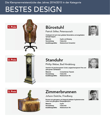 Die Wertungslisten wurden erneut von Klempnermeister Mark Holzwart programmiert. Bewertet wurden neben der Formgebung, dem Gesamteindruck und den Proportionen der Arbeiten auch deren Schwierigkeitsgrad sowie die handwerkliche Umsetzung. Aber auch die Idee hinter dem Meisterstück sowie die Live-Präsentation vor den Juroren wurden beurteilt. Die Mitglieder der Jury sind:
