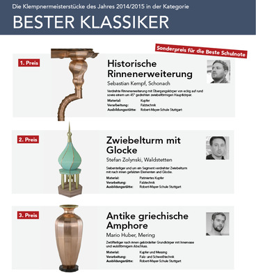 Es ist schon erstaunlich, wenn ein Meisterstück mit der Note 1,1 bewertet wird. Klempnermeister, die das von sich sagen können, gibt es kaum. Einer von ihnen ist Sebastian Kempf. Der talentierte Handwerker aus Schonach im Schwarzwald erhielt die Traumnote für seine historische Rinnenerweiterung, die er an der Stuttgarter Robert-Mayer-Schule fertigte. Die gedrehte Rinnenerweiterung verfügt über einen Übergangskörper von eckig auf rund sowie einen um 45° gedrehten zwiebelförmigen Hauptkörper.