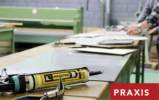 Das System Innotec Project zur Verklebung von Fassadenplatten ist seit über 20 Jahren in unveränderter Rezeptur auf dem Markt. Vom DIBt zugelassen und Komo-zertifiziert, eignet es sich hervorragend zur Befestigung von Metallfassaden-Elementen und anderen Fassadenplatten. Als erfahrener Fachmann für Klebeverbindungen weist Jürgen Fetzer die Teilnehmer in die praktische Handhabung unterschiedlicher Klebstoffe ein. Außerdem lernen die Teilnehmer, wie die Ermittlung des Klebemittelbedarfs vonstattengeht und warum in den meisten Anwendungsfällen auf den Einsatz eines Haftvermittlers verzichtet werden kann. Sie sind skeptisch? Überzeugen Sie sich bei der praktischen Anwendung und lassen Sie sich in das Klebeverfahren einweisen.