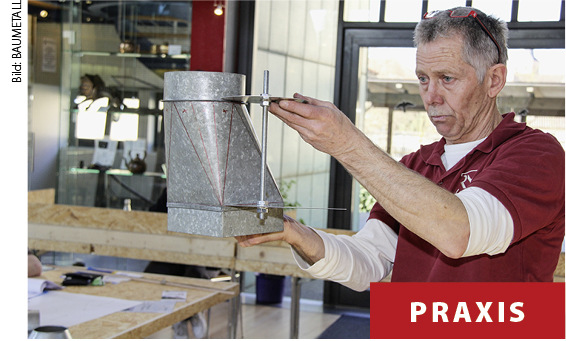 Erneut greift Meistermacher Gert Brenner tief in seine Klempner-Trickkiste! In diesem Spezialworkshop vermittelt er, wie das Baustellenleben bei der Regenrohrmontage spürbar erleichtert werden kann. Wenn Sie wissen wollen, wie ein Rohrwinkel beliebiger Neigung aus zwei glatten Rohrstücken ganz ohne Abwicklung hergestellt wird, ist das Ihr Workshop! Dazu Brenner: „Das sogenannte Ineinandersprengen der Rohrstücke ist einfacher, als viele Fachleute denken. Die extrem praktische Vorgehensweise ist perfekt zur handwerklichen Herstellung unterschiedlicher Neigungen auf der Baustelle geeignet. Sie werden staunen, wie schnell, effektiv und passgenau das Verfahren ist!“ Ein weiterer Workshop-Bestandteil befasst sich mit einem unglaublich schnellen und gleichermaßen einfachen Abwickelverfahren, das sogar zur Herstellung von Übergangskörpern geeignet ist. Es funktioniert ohne die Anfertigung sonst üblicher Abwicklungszeichnungen und liefert dennoch perfekte Ergebnisse. Das gibt es nur bei BAUMETALL!