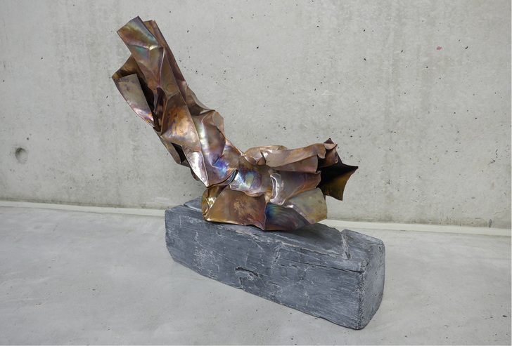 Manuela Geugelin hat keine Klempnersicht auf die Dinge. Vom Falzen hält sie nicht besonders viel und auch Techniken wie das Löten oder Nieten wendet sie nur an, wenn es sich nicht vermeiden lässt. Stattdessen schwört die Bildhauerin auf hauchdünnes Kupferblech und darauf, ihre Kunstgegenstände und Skulpturen aus einem einzigen Stück Metall anzufertigen. „Diese Herangehensweise zeichnet viele Bildhauer aus“, sagt sie und erklärt: „Steinskulpturen werden in der Regel aus einem einzigen Stein herausgearbeitet.“ So gesehen müssen perfekte Metall-Kunstwerke zwangsläufig aus einer einzigen Tafel Blech entstehen, denkt Buck und stellt die nächste Frage, deren Beantwortung ihn abermals überrascht. „Metall muss vor der Bearbeitung aufgeweckt werden“ sagt die vor Begeisterung sprühende Künstlerin. Auch davon hat der wissbegierige Klempnermeister noch nie gehört, obwohl er müde Metallbearbeiter oder verschlafene Azubis schon oft getroffen hat. „Auf die Idee, anstatt des müden Handwerkers dessen Werkstück zu wecken, wäre ich nie gekommen“, scherzt Buck, doch Manuela Geugelin meint es ernst. Und der Blick auf ihre Arbeiten zeigt, wie effektiv ihre Technik sein muss. Bucks Interesse fällt auf eine ausdrucksstarke Skulptur, die aussieht, als wäre ihre Kupferhaut erschlafft. Dennoch strahlt die Arbeit eine scheinbar aus dem Material dringende Spannung aus. Es entsteht der Eindruck, als würde das verformte Kupfer unter großer Anstrengung danach streben, wieder in seinen einstigen, spiegelglatten Ausgangszustand zu gelangen. Doch irgendwie wird das rotbraune Gebilde durch die geschickte Anordnung zahlreicher Falten in Position gehalten.