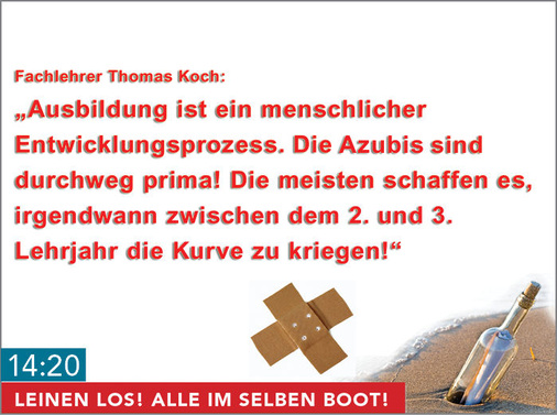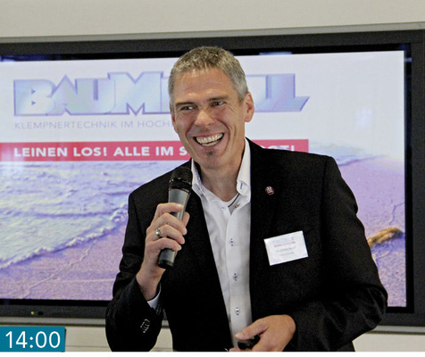 14:00 Leinen Los! BAUMETALL-Chefredakteur Andreas Buck eröffnet die Veranstaltung mit etwas Seemannsgarn und einem sehr ernsten Thema. In seinem Fachvortrag macht er auf die schlechte Ausbildungssituation aufmerksam. Dabei weist er auf die ZVSHK-Lehrstellenstatistik hin, die aktuell einen Rückgang von 18% verzeichnet!