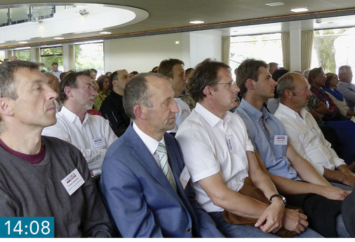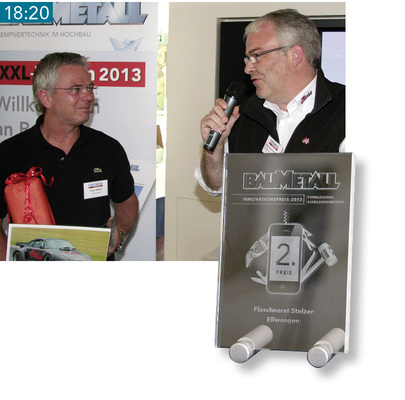 14:21 Fotowettbewerb Nach dem ernsten Thema verschafft der BAUMETALL-Fotowettbewerb repräsentative Einblicke in zahlreiche Werkstätten. Die anschließende Präsentation der Preisträger lockert die Stimmung auf. Für den Fachbetrieb Jürgen Stifter aus Petersaurach nehmen Patrick und Nadja Stifter den 3. Preis entgegen. Den 2. Preis sichert sich Renate Mayr aus Tegernbach.
