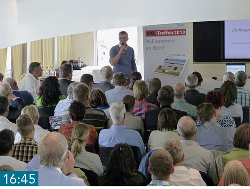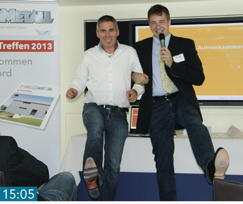 15:05 Wir haben Schuhe an, Sie wissen was ich meine! Als sich Andreas Buck bei Peter Niedermaier für den gelungenen Fachvortrag bedankt, weist dieser auf ein sehr entscheidendes Detail hin: Referenten und Veranstalter des XXL-Treffs 2013 haben ausnahmslos Schuhe an. Die Anspielung Peter Niedermaiers zielt auf den XXL-Treff 2012 und den dort kontrovers diskutierten Vortrag eines Zukunftsforschers ab. Dieser hatte mit seinen barfüßig aufgestellten Thesen bei so manchem Teilnehmer für Kopfschütteln gesorgt. Die „kleine Tanzeinlage“ der beiden wird mit großem Applaus belohnt, was zeigt, dass zahlreiche Teilnehmer bereits 2012 dabei waren.