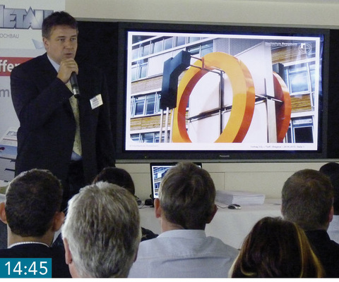14:45 Weiterbildung Prof. Dr. Peter Niedermaier referiert über den kurz bevorstehenden Start der Studienrichtung Gebäudehülle an der Fachhochschule in Rosenheim. Dort befassen sich angehende Ingenieure ab dem Wintersemester 2013/14 mit Konstruktionen und baulichen Umsetzungen von Fassaden, die zugleich architektonische, energetische und gebrauchstaugliche Anforderungen der Gebäudehülle erfüllen. Das komplexe Weiterbildungsangebot deckt einen weltweit stark wachsenden Bereich ab – das Studienangebot der Hochschule Rosenheim ist ein im deutschsprachigen Raum einmaliges Angebot. Interessant ist die Studienrichtung für Klempner und andere Unternehmen der Bauindustrie sowie für Planungsgesellschaften und alle, die auf dem stark wachsenden Markt der energetischen Sanierung oder im Neubau energieeffizienter und intelligenter Gebäude tätig sind. Schwerpunkte des 7-semestrigen Studiums liegen in den Kernbereichen Konstruktion, Bauteile, Materialeinsatz, Solar- und Regelungstechnik, Projektsteuerung, Fertigung sowie Sanierung und Brandschutz.