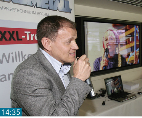 14:35 Begeisterung Das humorvolle Video sorgt für beste Laune im bis auf den letzten Platz belegten Vortragssaal. Es zeigt den auf dem Dach seiner Werkstatt rockenden VDSS-Präsidenten Christoph Aeberhard sowie dessen Frau Patrizia beim Blechrollen-Surfen – einer offensicht­lich neuen Extremsportart für Spengler.