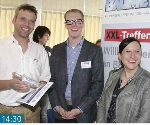 14:30 Blick ins Klempnerherz Spenglermeister Norbert Heinzlmeier aus Schrobenhausen sichert sich mit seinem Foto „Blick in unser Klempnerherz“ den 1. Preis. Er gewinnt ein BAUMETALL-Azubi-Abo, das ihm Robert Reisch (Verlagsleiter New Business Development) und seine Frau Julia Reisch überreichen.