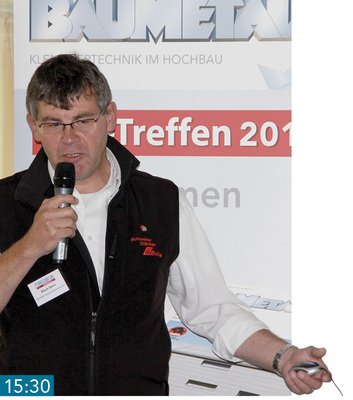 13:40 Internationales Branchentreffen Willkommen an Bord: Auch in Bregenz begrüßt BAUMETALL-Chefredakteur Andreas Buck die Gäste persönlich. Neben der österreichischen Spenglerdelegation um Othmar Berner, Ernst Zimmermann, Thomas und Fritz Reinbold (Bild) sind Klempner aus Australien, Deutschland, Italien, Luxemburg, Russland, der Schweiz, Südtirol und Ungarn vertreten.