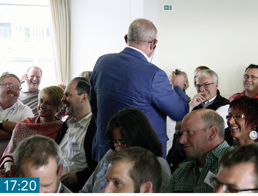 16:30 iib-Netzwerk Peter Trenkwalder (iib-Präsident) macht mit dem Zitat „Reisen veredelt den Geist und räumt mit allen anderen Vorurteilen auf*“ auf die großen Chancen aktiver Netzwerknutzung aufmerksam. Wie diese aussehen kann schildert er anhand des bereits aktiv gelebten Austausches von Lehrstellen auf bestimmte Zeit. Spontan bittet er einen Austausch-erfahrenen Junggesellen vom iib-Mitgliedsbetrieb Stifter ans Mikrofon.