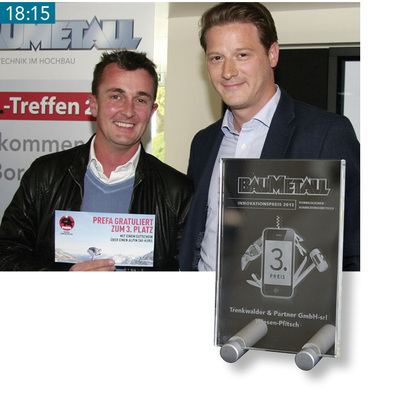 18:15 Zwei dritte Preise Aufgrund eines Punktgleichstandes teilen sich die Hermann Bade Dächer GmbH & Co. KG und die Trenkwalder & Partner GmbH-srl den dritten Preis. Beide Firmen gewinnen einen Prefa-Profi-Skikurs für je einen Auszubildenden und einen Ausbilder. Überreicht wird der Gutschein von Prefa-Geschäftsführer Leopold Pasquali – Skilehrer ist der österreichische Freestyle-Skiläufer Andi Matt. (Baumetall berichtet)